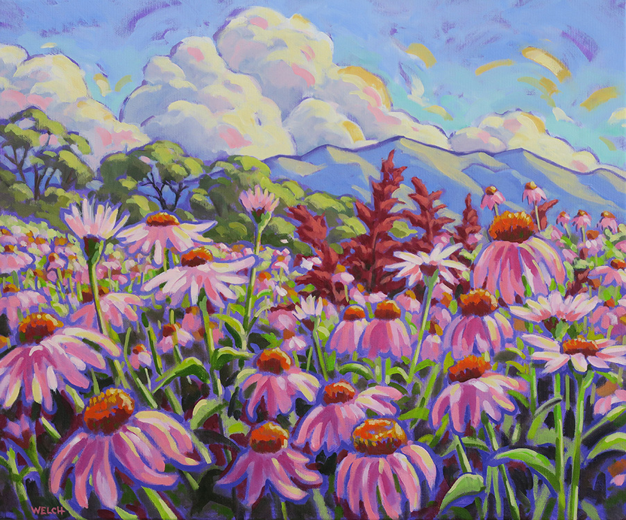 I use color and light to try to express the energy, the life force, that I feel in Nature. My oil paintings are built up in layers. In an underpainting I establish the drawing and values, in colors that differ significantly from the intended finish. Through successive layers, a complementary under-painting may show through as a subtle variation that adds complexity to a surface. Sometimes I choose to leave strong accents of the original color to enliven the overall color conversation.